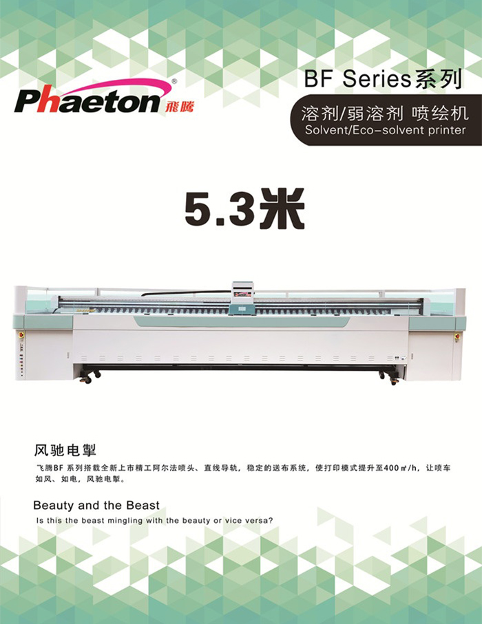 飛騰BF系列搭載全新上市精工阿爾法噴頭、直線導(dǎo)軌,穩(wěn)定的送布系統(tǒng),使打印模式提升至400㎡/h,讓噴車如風(fēng)、如電,風(fēng)馳電掣。