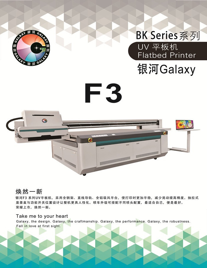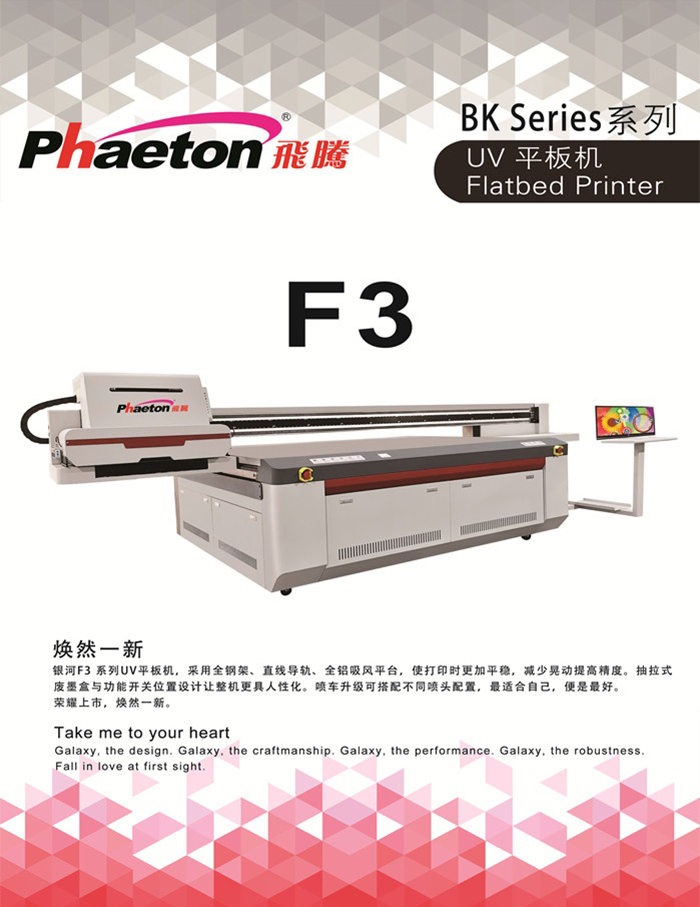 銀河F3系列UV平板機(jī),采用全鋼架、直線導(dǎo)軌、全鋁吸風(fēng)平臺,使打印時(shí)更加平穩(wěn),減少晃動(dòng)提高精度。抽拉式廢墨盒與功能開關(guān)位置設(shè)計(jì)讓整機(jī)更具人性化。噴車升級可搭配不同噴頭配置,最適合自己,便是最好。 榮耀上市,煥然一新。