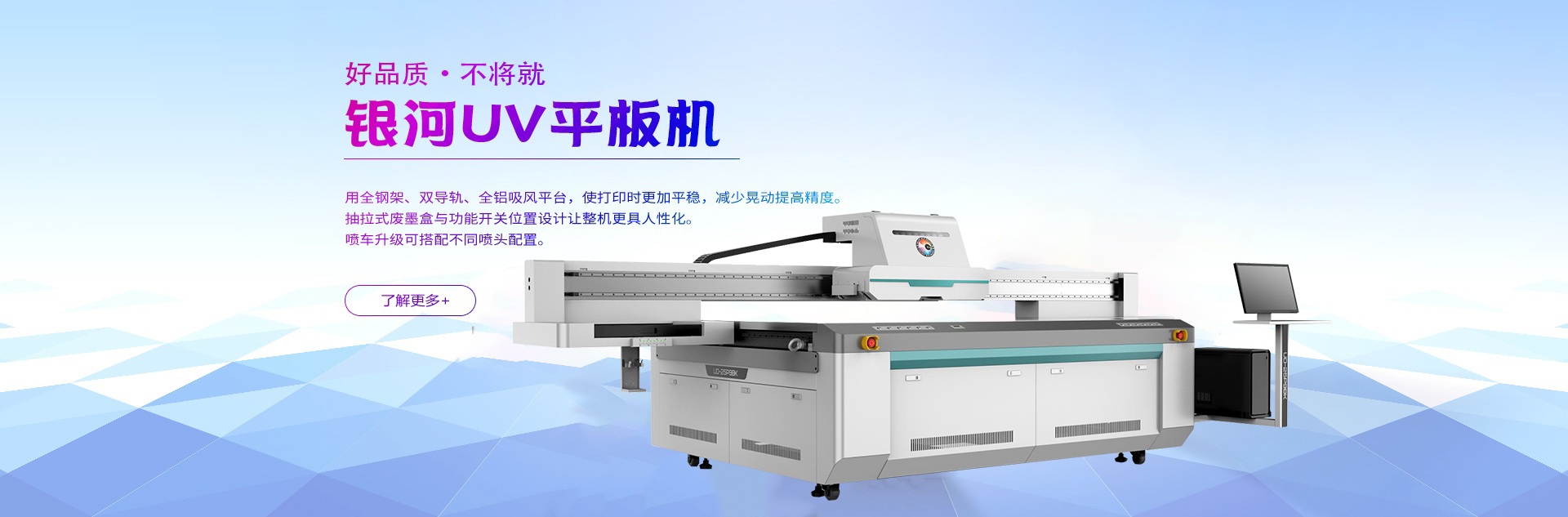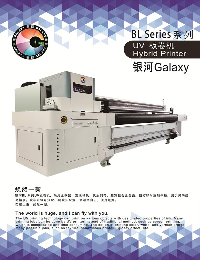 銀河BL系列UV板卷機(jī),采用全鋼架、直線導(dǎo)軌、優(yōu)質(zhì)網(wǎng)帶,超寬鋁合金臺面,使打印時(shí)更加平穩(wěn),減少晃動(dòng)提 高精度。噴車升級可搭配不同噴頭配置,最適合自己,便是最好。 榮耀上市,煥然一新。